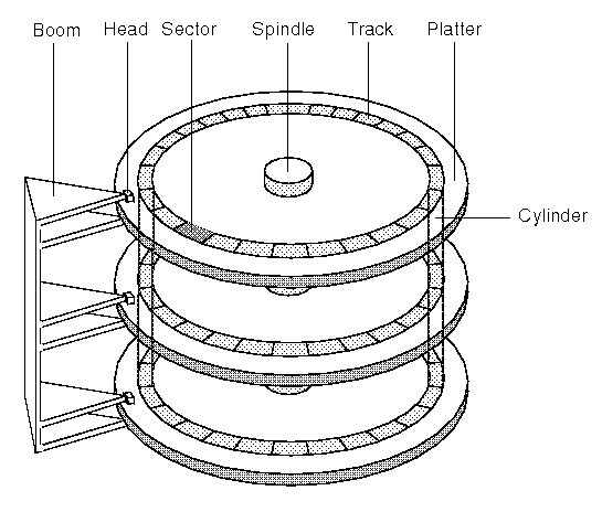 ``Hard disk geometry and terminology'' shows the internal architecture of a hard disk and its associated terminology.