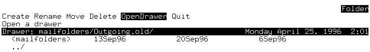 Select OpenDrawer, and pick the drawer you want to see, (for example Outgoing.old); its contents appear on the screen and the divider line displays its name: