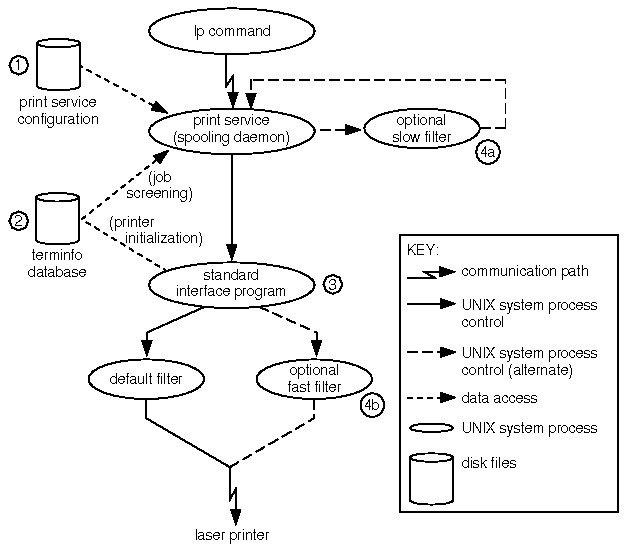 The diagram in ``Overview of print request processing'', gives an overview of the processing of a print request.